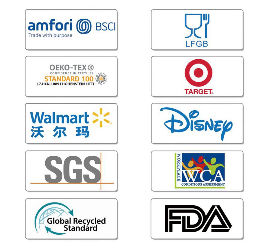 公司視產(chǎn)品質(zhì)量如生命,始終堅持“以創(chuàng )新誠信求生存,以品種質(zhì)量謀發(fā)展”的質(zhì)量方針。公司先后通過(guò)ISO9001:2015質(zhì)量管理體系認證、ISO14001:2015環(huán)境管理體系認證及知識產(chǎn)權管理認證、SQP、FDA、GRS認證,以及歐盟BSCI認證、加拿大MDEL認證;通過(guò)美國沃爾瑪驗廠(chǎng)、迪士尼驗廠(chǎng)、塔吉特驗廠(chǎng)、WCA驗廠(chǎng);產(chǎn)品通過(guò)歐洲Oeko-Tex standard 100生態(tài)紡織品1類(lèi)(嬰幼兒)產(chǎn)品認證;通過(guò)SGS檢測及BV檢測,不含增塑劑、雙酚A、福爾馬林等有害物質(zhì);有害重金屬及有害物質(zhì)符合歐盟EN 71玩具安全標準,符合美國ASTM F963玩具標準;產(chǎn)品材料符合德國LFGB食品接觸材料管理法、歐盟Reach法規、ROHS指令的相關(guān)環(huán)保標準;抗靜電性能符合歐盟EN 1149抗靜電檢測標準。